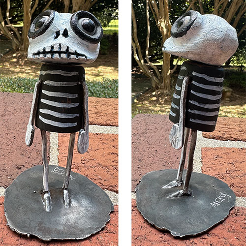 This piece is created with a painted wood body and metal limbs. Measures 5" tall on a 3" x 2.75" base.