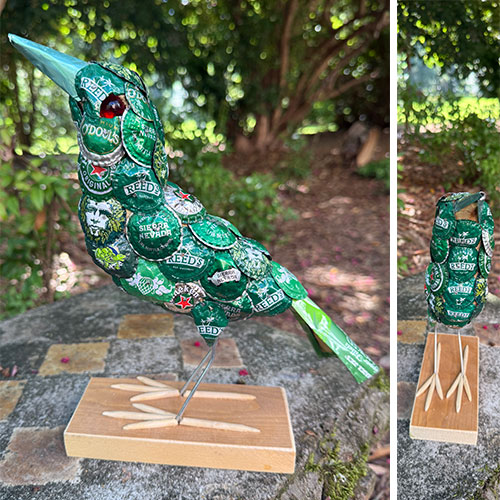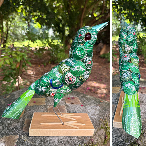 An army of friends and acquaintances work tirelessly to keep John supplied with items used to create his pieces. This bird is 10.5" tall and 12.5" long, beak to tail. The wood base is 6" x 2.75". Bottle caps are arranged over a wood foundation.
