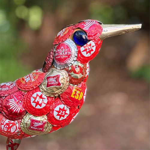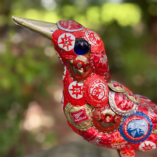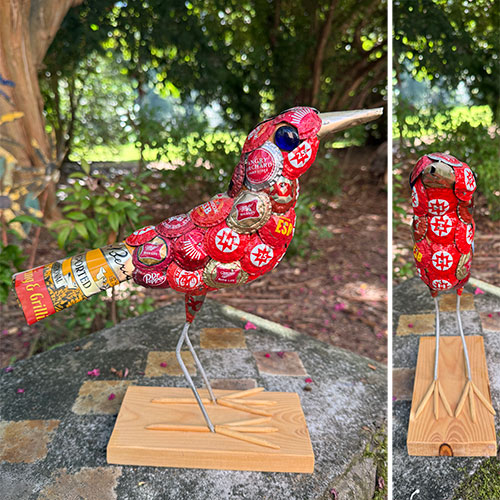 An army of friends and acquaintances work tirelessly to keep John supplied with items used to create his pieces. This bird is 11.25" tall and 12.5" long, beak to tail. The wood base is 6.75" x 3.25". Bottle caps are arranged over a wood foundation.