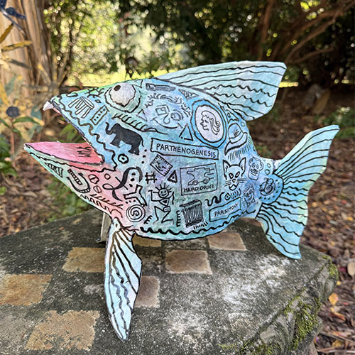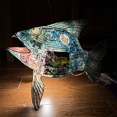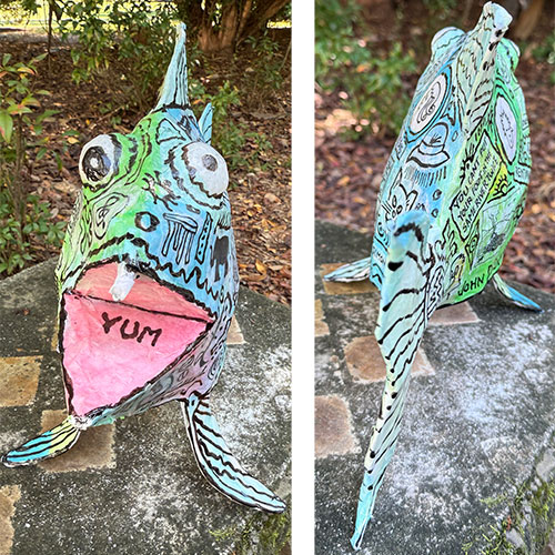 Sometimes a room needs a little light, and lots of personality. John's lamps will force a smile out of you 'cause they are just so darn much fun. Presented for your amusement, a Fish lamp. Created with vinyl-ized (is that really a word?) paper over a wire frame. Really a sculpture that happens to light up. UL approved lighting fixture. Cord off and on switch. Every sculpture is handmade & therefore unique. Finally. Something really cool for the fish people. Measures 11" tall to top of fin and 16" from mouth to tail. It is 8" across the front.
