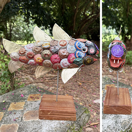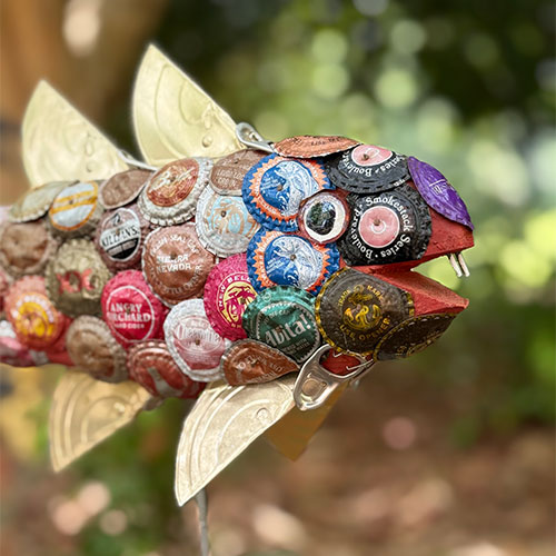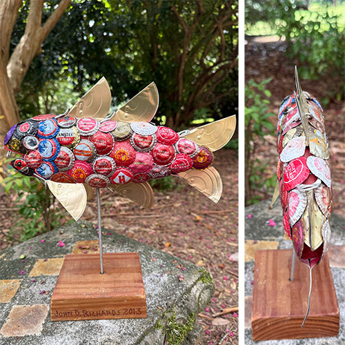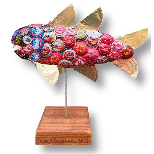 An army of friends and acquaintances work tirelessly to keep John supplied with items used to create his pieces. This fish is 12.5" tall and 13" long nose to tail, and it's 3" deep. The wood base is 4"x5"x2" Bottle caps are arranged over a wood foundation.