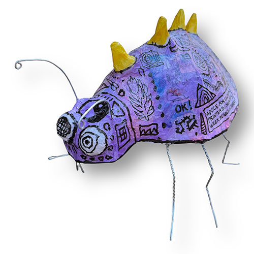 This playful creature/bug lamp by John Richards showcases the artist’s distinctive approach to sculptural lighting and narrative drawing. Built over a hand-bent wire armature, the form is layered with tissue and paper to create a translucent shell that becomes the body of the piece. Richards then covers the entire surface with his signature doodles—humorous sketches, symbols, cryptic notes, and graphic patterns that wrap around the creature like a living sketchbook. The drawings transform the sculpture into a story-filled object, encouraging close inspection and multiple readings. Both humorous and inventive, Richards’ lamps combine hand-built sculpture, spontaneous drawing, and functional light into objects that feel playful, personal, and unmistakably handmade.