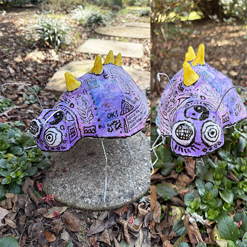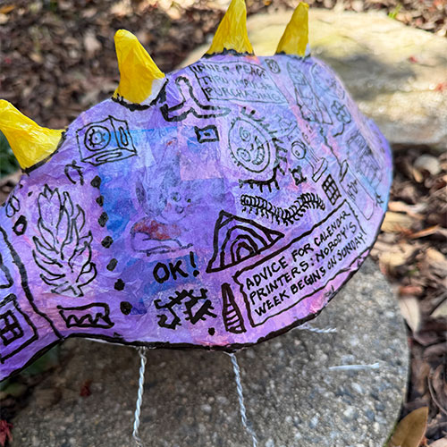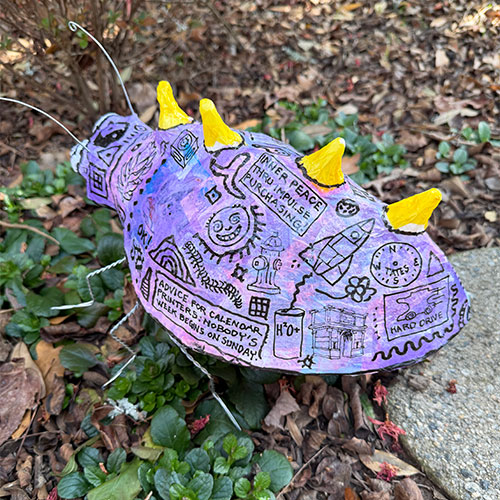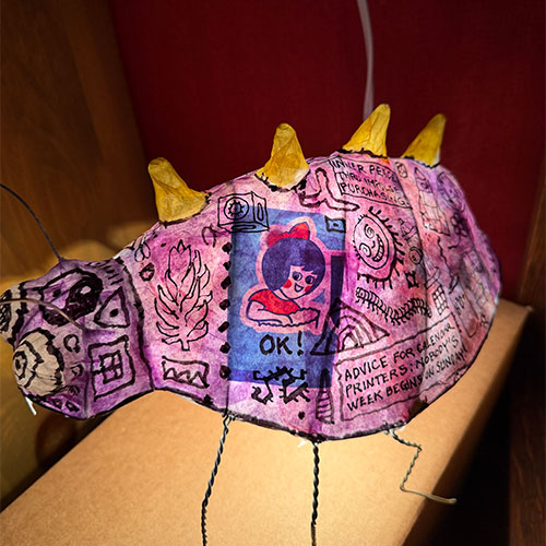 Spikes along the creature’s back and exaggerated features give the form a mischievous personality somewhere between folk animal, cartoon invention, and dreamlike beast.