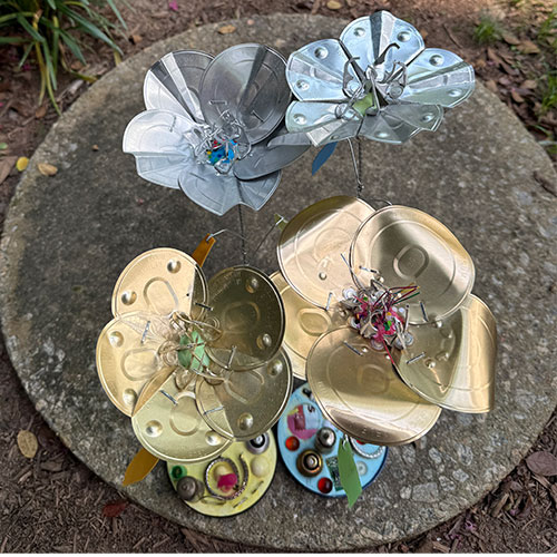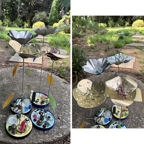 An army of friends and acquaintances work tirelessly to keep John supplied with items used to create his pieces. John lovingly calls these, "flowers that will not die" and are made entirely from recycled materials from cat food lids as petals to odds and ends in the base. Large flowers are 15" tall with a 4.5" base.