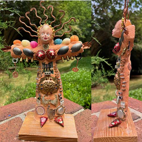An army of friends and acquaintances work tirelessly to keep John supplied with items used to create his tabletop pieces. This piece measures 13.5" tall to tip of wings, 9" across hands mounted on a 5.5" x 3.5" wood base