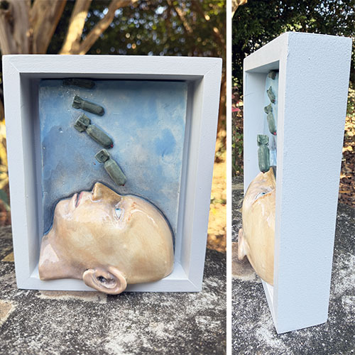 As with much of Hetherington’s work, the piece balances humor and discomfort. It is straightforward, emotionally accessible, and visually immediate. The raised forms and dimensional structure create depth, making it both sculpture and wall-based narrative object.
