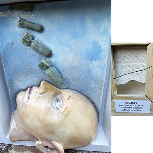 Hand-built in clay and kiln-fired, the surface is softly modeled with subtle glaze tones that contrast against the harder, symbolic forms above. The small printed text element—“ANXIETY: sometimes all you can do is watch the looming and hope for the best”—grounds the work in sharp, understated commentary.