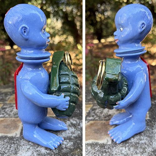 The Baby Blue is a hand-built ceramic sculpture featuring a blue childlike figure holding an oversized green grenade. On the back, a raised red arrow points upward with the words “THE SOFT SPOT,” directing attention to the top of the figure’s head.