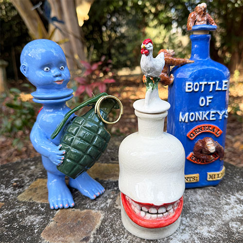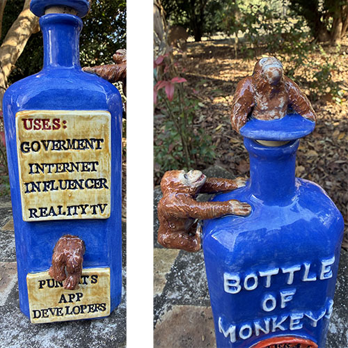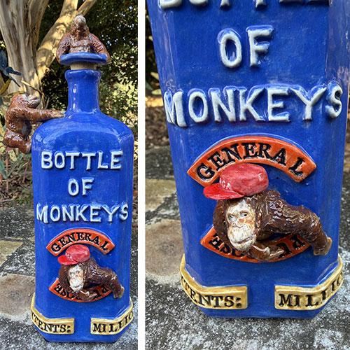 Bottle of Monkeys is a hand-built ceramic sculpture that transforms a familiar phrase into a bold, three-dimensional object. The deep blue bottle form is topped and surrounded by sculpted monkeys climbing and clinging to the surface. Raised lettering on the front reads “BOTTLE OF MONKEYS,” reinforcing the playful yet pointed concept.
