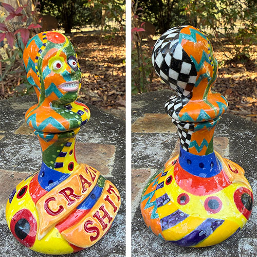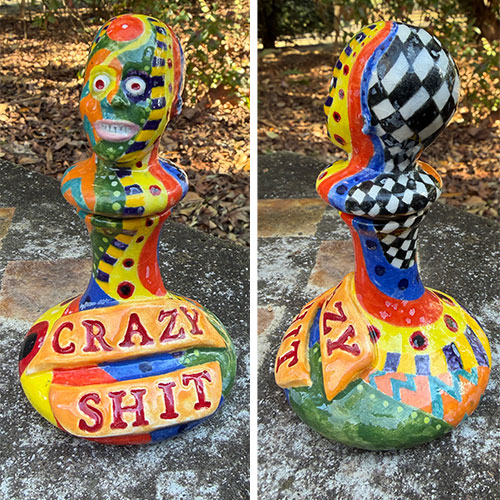 Crazy Shit is a hand-built ceramic bust that pairs bold surface pattern with blunt language. The colorful head rises from a rounded base bearing raised lettering that reads “CRAZY SHIT,” setting the tone immediately.