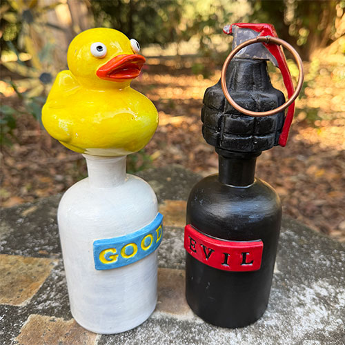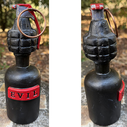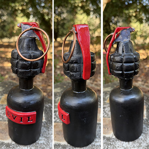 Evil is a hand-built ceramic sculpture shaped like a bottle and topped with a detailed grenade form. Finished in matte black glaze with bold red accents, the piece carries a raised plaque reading “EVIL” across the front.