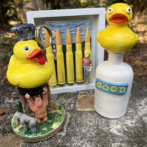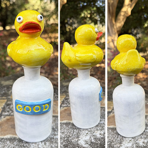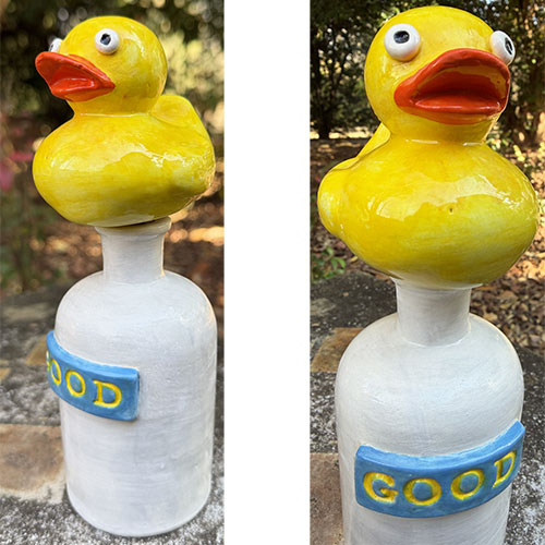 Good is a hand-built ceramic sculpture featuring a bright yellow duck perched atop a simple bottle form. The clean white base is interrupted by a raised blue plaque reading “GOOD,” giving the piece its title and tone.