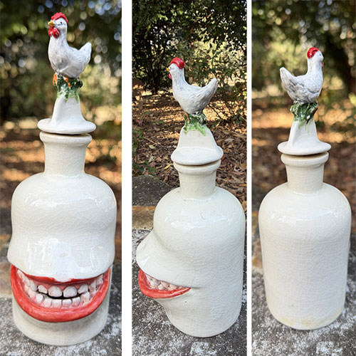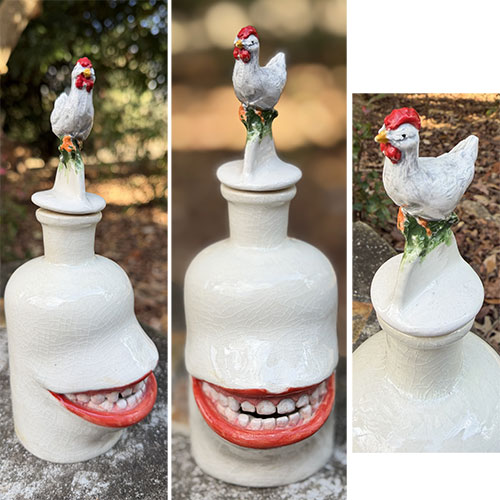 This hand-built ceramic sculpture features a tall white bottle form crowned with a small rooster. Below, a wide red-lipped grin wraps around the lower portion of the vessel, revealing detailed teeth that contrast sharply with the otherwise minimal surface.