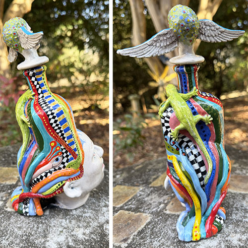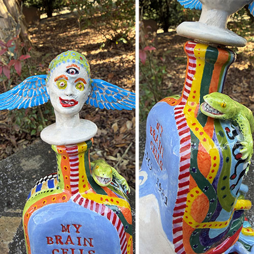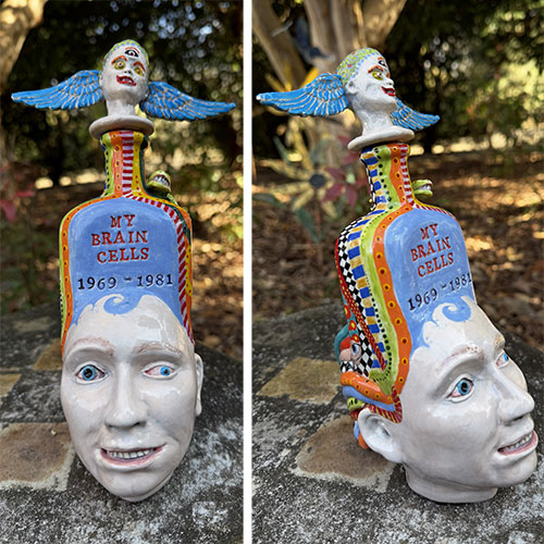 My Brain Cells 1969–1981 is a vividly glazed ceramic sculpture combining figurative portraiture with symbolic bottle form. A sculpted head anchors the base, while a tall, patterned neck rises upward, crowned by a winged figure. The front inscription reads “My Brain Cells 1969–1981,” immediately setting a tone of humor and self-reflection.