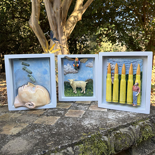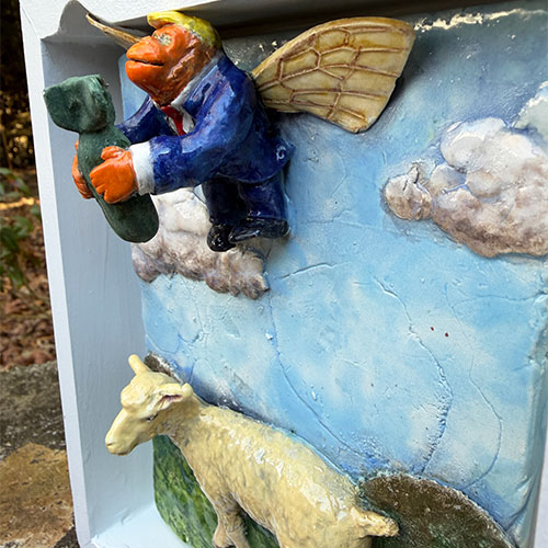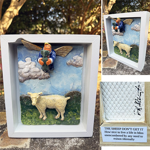 In The Sheep Don’t Get It, a winged figure hovers in the sky above a single sheep standing calmly below. Set inside a shadowbox-style frame, the scene reads like a quiet parable—open to interpretation but grounded in irony.