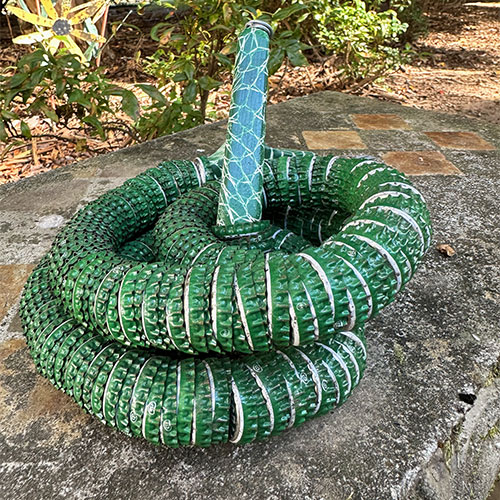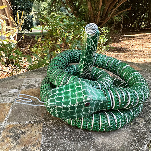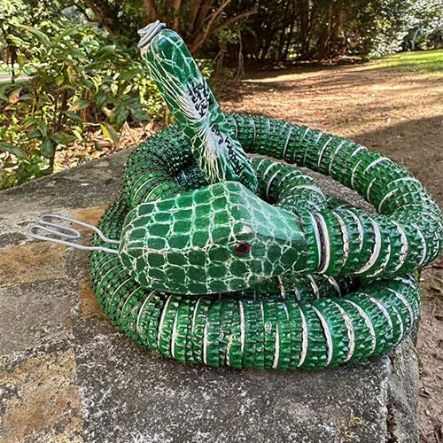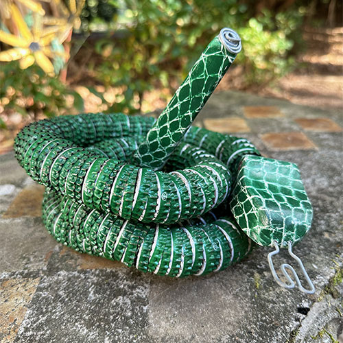 This piece measures would measure approx 5' long if uncoiled - but then it wouldn't look as funky. The head and rattler are carved and painted wood.