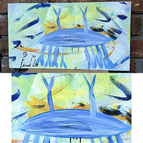 Those who know the work will understand measurements vary from panel to panel, as does the quality of the board used. Sometimes you'll find small blades of grass as part of the piece - not a purposeful addition - that's what happens as Ernest Lee paints and tosses his work to dry on the ground. If you expect a pristine, perfectly straight and smoothly cut piece of wood, you may want to consider another artist. Just say'n.