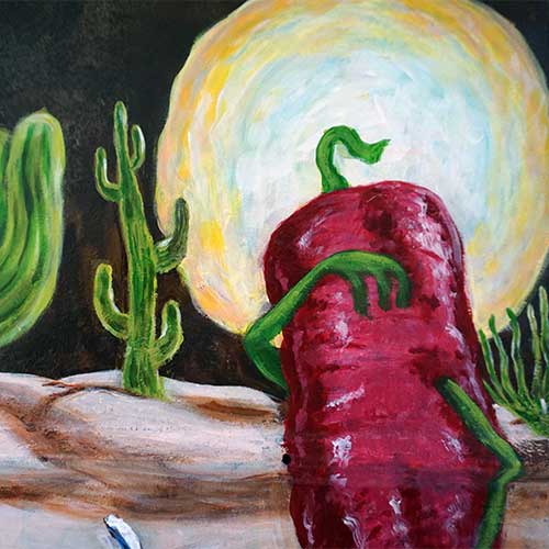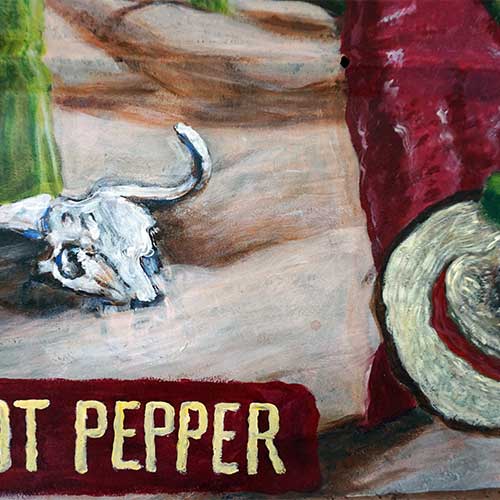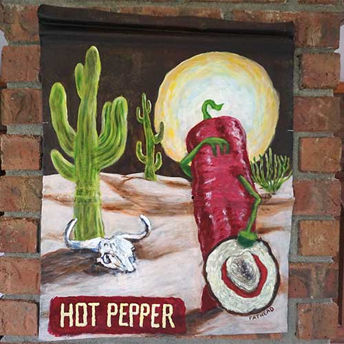 Hot Pepper is painted on tin and measures 19" wide and 24" long.
