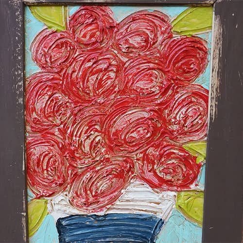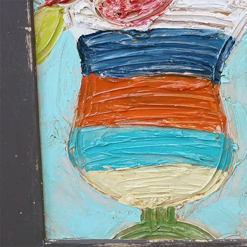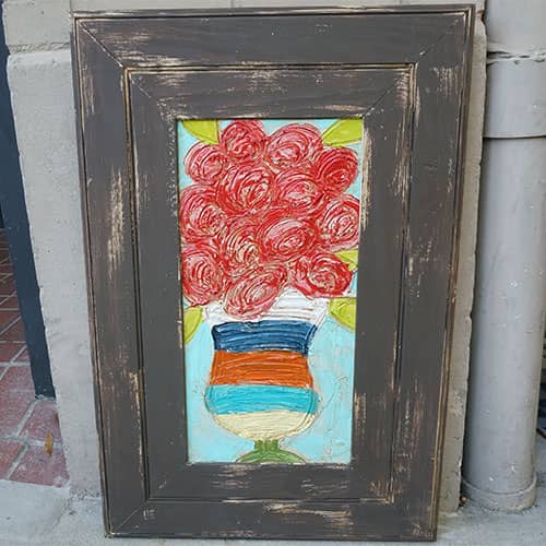 Vase of flowers is painted on 20" x 30" x .25" wood, with acrylics. Susan's characteristic technique of applying thick layers is evident. Pleaser see the detail photos to view how the panel is constructed. Basically, the painting is framed by a handpainted and constructed frame.
