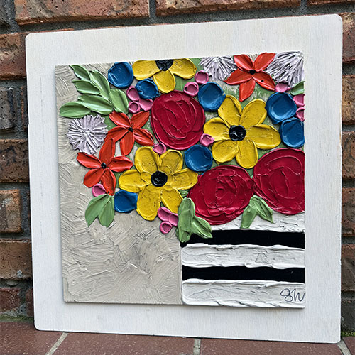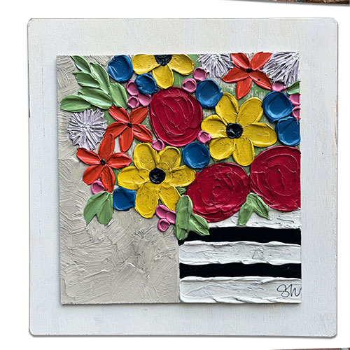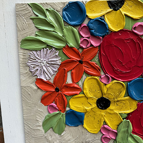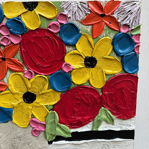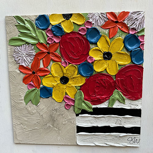 Painting is on wood with a wire for hanging. 18" x 18" (includes a 2" border) painted with acrylics. Susan's characteristic technique of applying thick layers is evident.