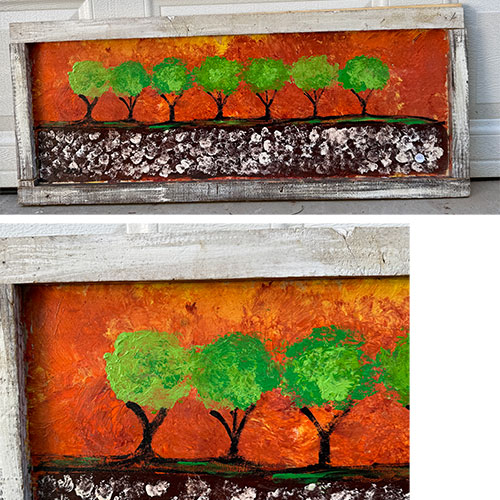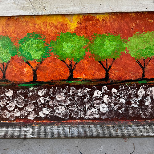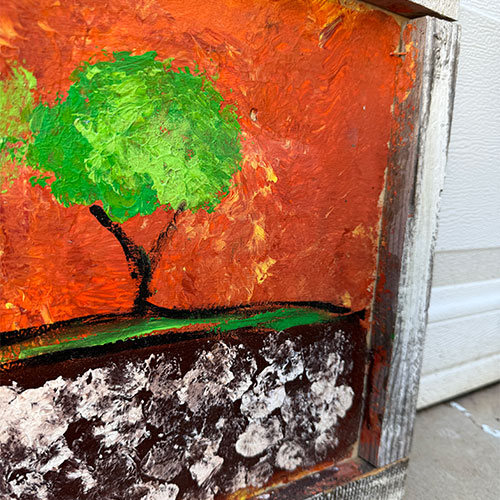 Billy likes to paint outside the lines. With no formal art education, he goes with the flow and lets the painting make a life of its own. He uses reclaimed materials and bold colors to create whimsical and thoughtful pieces. That said, please acknowledge that the marterials are recycled and therefore not perfect.