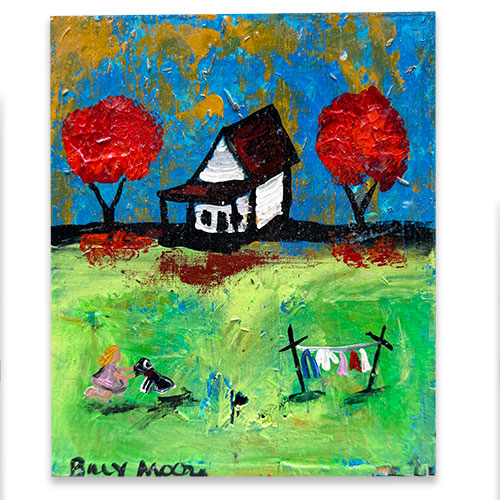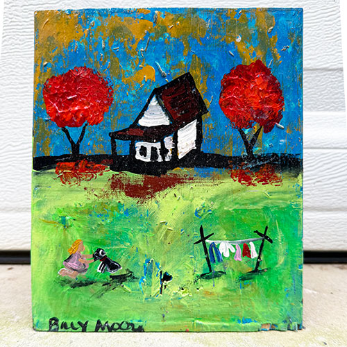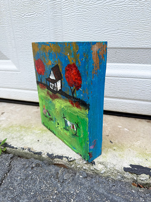 Billy likes to paint outside the lines. With no formal art education, he goes with the flow and lets the painting make a life of its own. He uses reclaimed materials and bold colors to create whimsical and thoughtful pieces. That said, please acknowledge that the marterials are recycled and therefore not perfect.