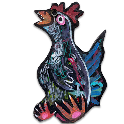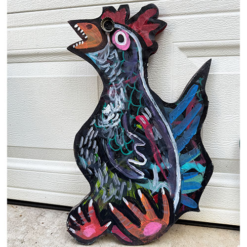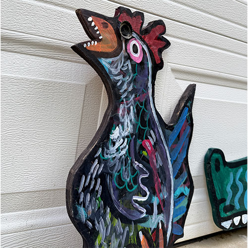 "My work is mainly based off of wacky characters that I’ve created over the years with the occasional head nod to pop-culture references within media and film. Originally I use to paint mainly on canvas until I attended Tony Dotson’s show at the Orphanage Gallery in Dayton Ohio. After meeting him, he inspired me to explore what I could do creatively with found wood." -Cayman K