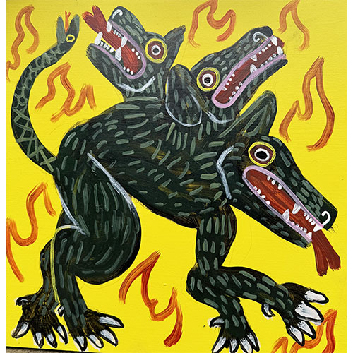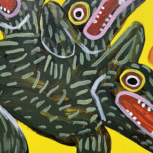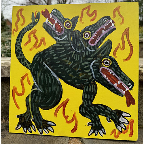 "My work is mainly based off of wacky characters that I’ve created over the years with the occasional head nod to pop-culture references within media and film. Originally I use to paint mainly on canvas until I attended Tony Dotson’s show at the Orphanage Gallery in Dayton Ohio. After meeting him, he inspired me to explore what I could do creatively with found wood." -Cayman K