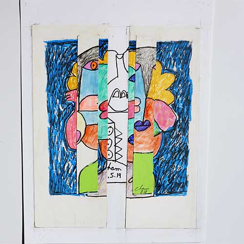 Cham does not title his work but he does sign and date it when completed. When he decides to work on the painting again, he will date it with the second (or even third) date the work was completed. Cham creates work every single day. A lot of it is on paper with pencil, acrylic, and marker. After some time has passed and the works accumulate, he takes pieces and rips, tears or cuts them into strips which he then uses to create another art piece. This is one of those.