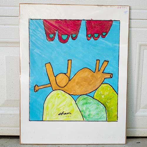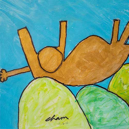 Cham does not title his work but he does sign and date it when completed. When he decides to work on the painting again, he will date it with the second (or even third) date the work was completed. Cham creates work every single day. A lot of it is on paper with pencil, acrylic, and marker. After some time has passed and the works accumulate, he takes pieces and rips, tears or cuts them into strips which he then uses to create another art piece.