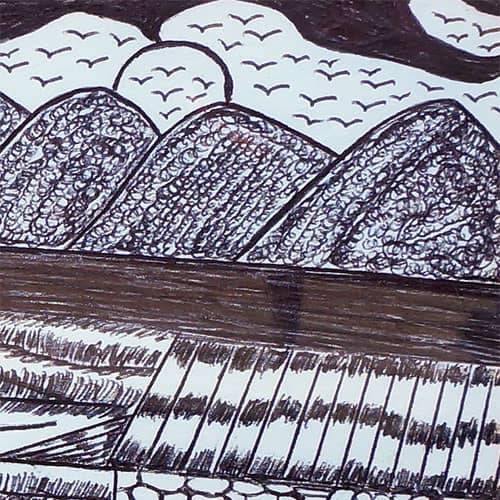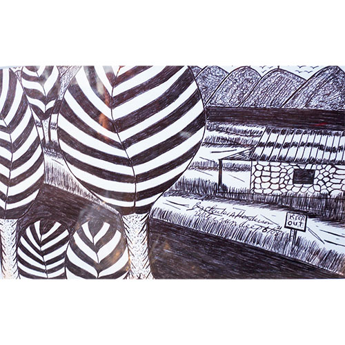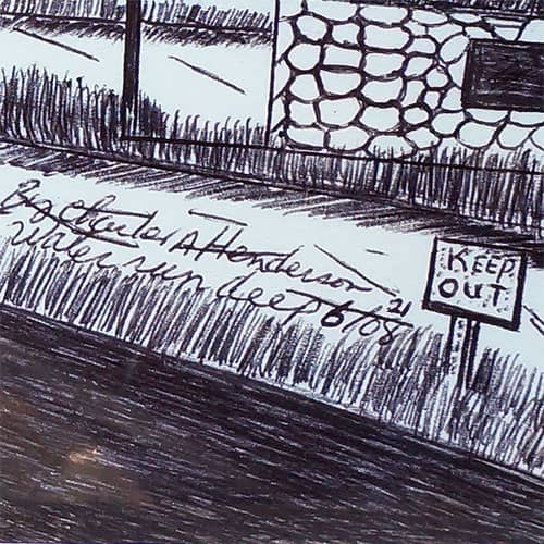 There was a time when Charles found himself spending a little time as a guest of the state. That's another story and it's his to tell. But as a result of that time, he created numerous pen and ink drawings. They were drawn on the reverse side of prison forms, like commissary requests, rules, etc. He spent a good deal of his time keeping busy in this way. The images are drawn from his imagination and remembrances of the area where he grew up. He mentioned that everywhere he went there were "Keep Out" signs and they are a reoccurring image within his work.