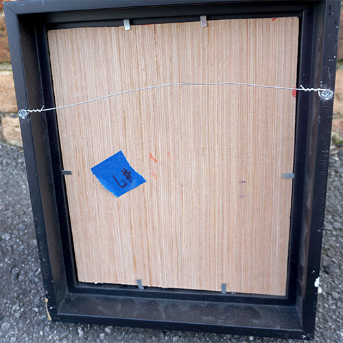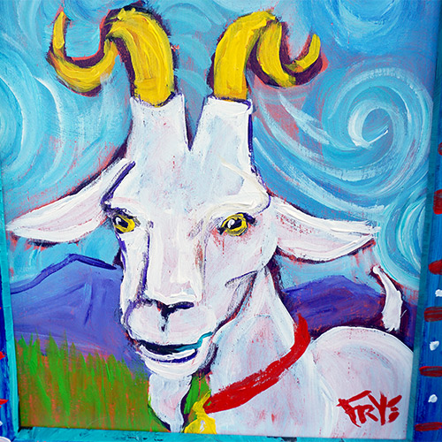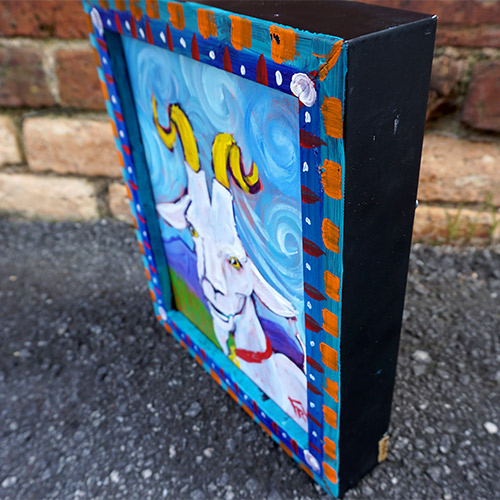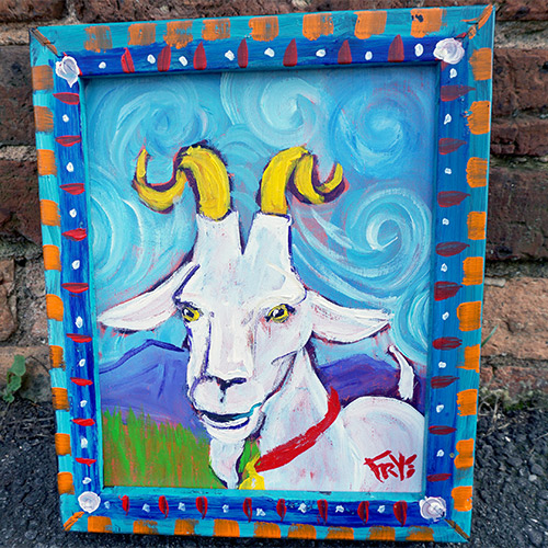 Here, he's painted a very confident looking goat portrait on wood. He's painted a found frame with complimentary designs. The framed piece measures 9.5" wide and 11.5" long. It's wired for hanging.