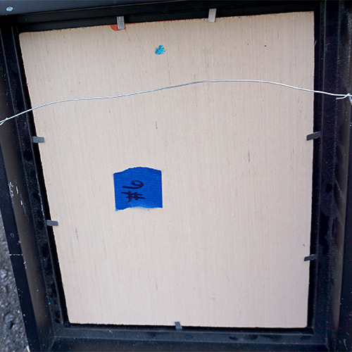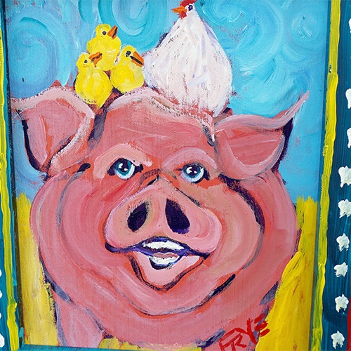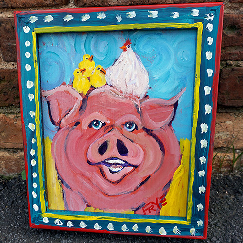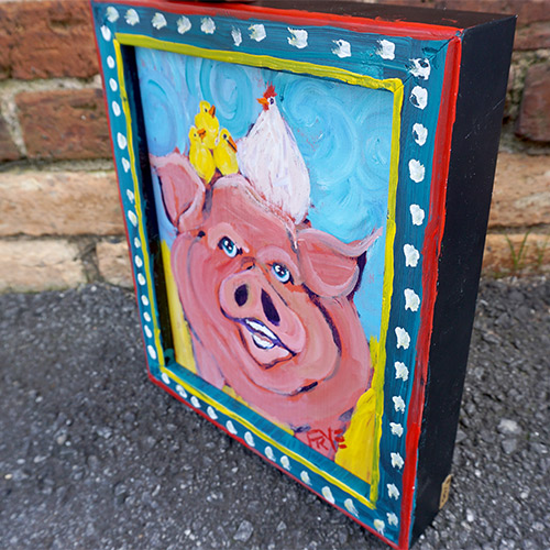 Here, he's painted a very contented looking pig portrait on wood. He's painted a found frame with complimentary designs. The framed piece measures 9.5" wide and 11.5" long. It's wired for hanging.