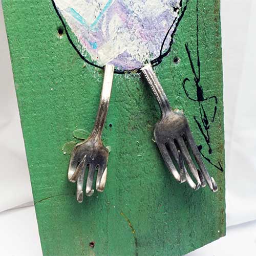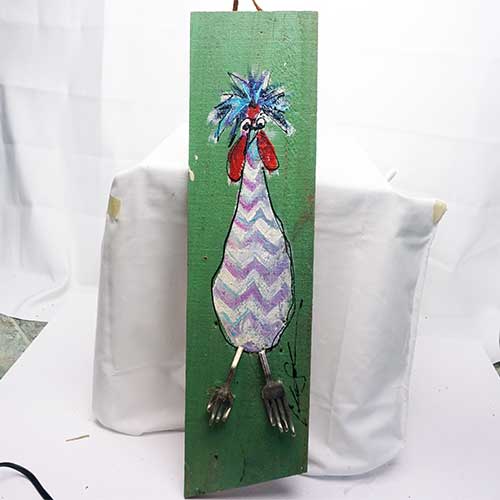 Fun folk art "Love Shacks" are created by Christy Buchanan in her studio snuggled inside her SHE garden. Chicken painted on salvaged wood with curved fork feet. Hangs on the wall. Use the feet to hold your keys, the dog leash or your face mask. Perfect gifts for the new home owner!