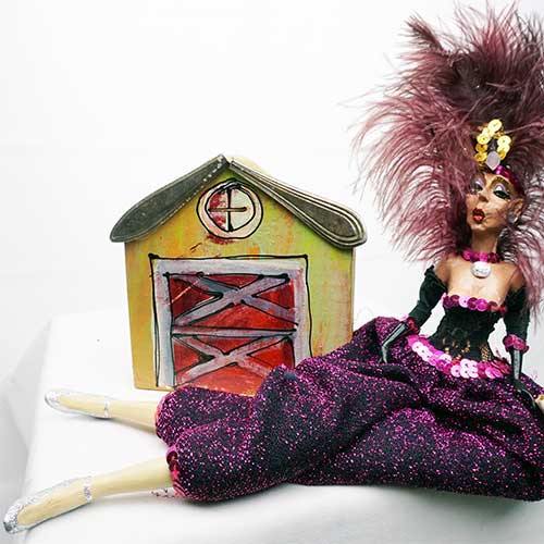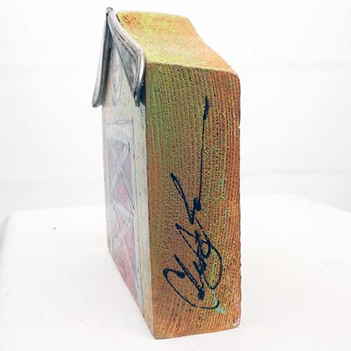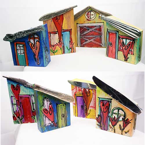 Fun folk art "Love Shacks" are created by Christy Buchanan in her studio snuggled inside her SHE garden. The wood is culled from the cuttings from her various projects. The handles are actually the pieces left over from another art project. Perfect gifts for the new home owner!