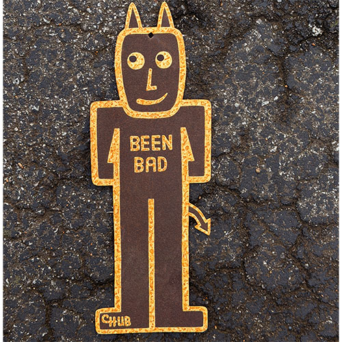 Rather than slick, modern materials, Chub Hubbard uses what’s on hand — rusted metal, scrap wood, tin — rooting his work in traditions of folk craftsmanship, bricolage, and outsider art. That gives his pieces authenticity and a rebellious DIY aesthetic. His tin cut outs are each cut and filed by hand eliminating sharp edges.