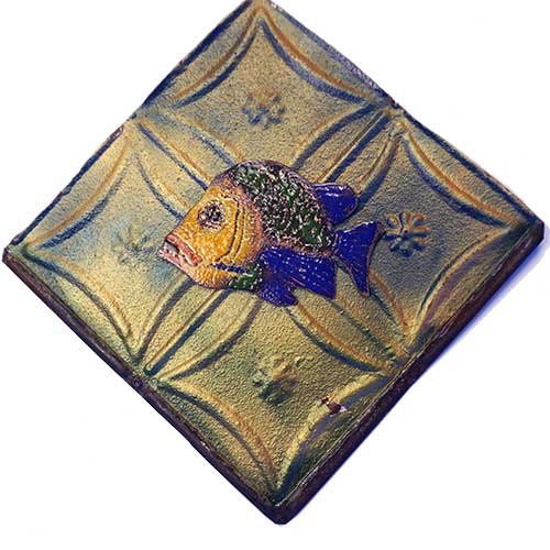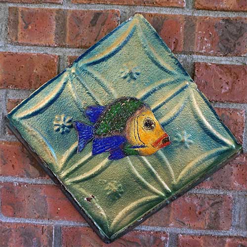 The old tin has been sprayed with a coat of paint and allowed to peel to reveal aged tin below. Tile is 12"x12" with hanging wire on the back.