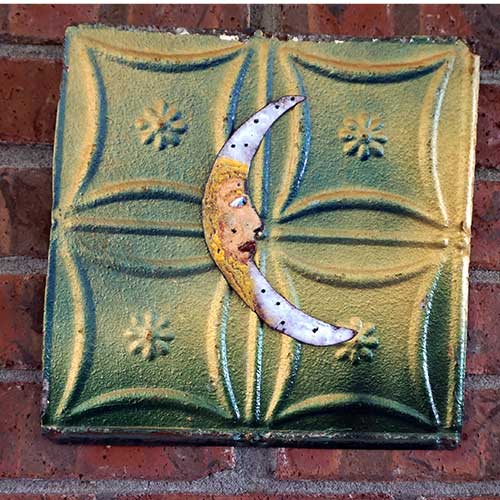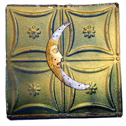 Many of Denny Maloney's artworks have spiritual or religious references. A lot of pieces incorporate found and salvaged objects. Tin ceiling tiles and cupboard doors make frames for enamel pieces.