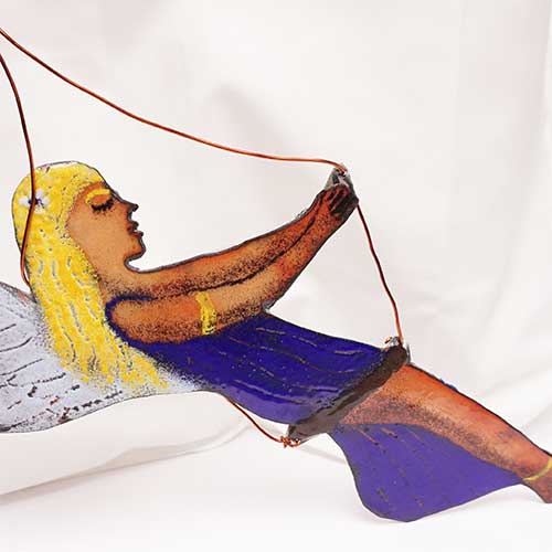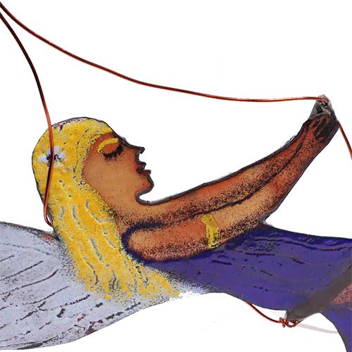 This angel is set on aluminum and was designed by Denny to be hung outside. Say in a tree. The copper wire is flexable enough for you to afix it to a branch. Or - you could hang it on the porch or even inside. 14" long and 4.25" wide.