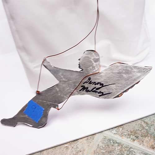 Many of Denny Maloney's artworks have spiritual or religious references. A lot of pieces incorporate found and salvaged objects. Tin ceiling tiles and cupboard doors make frames for enamel pieces.