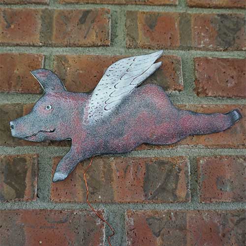 This copper enamel flying pig is 14" wide and 6" long. Hanging wire on the back.