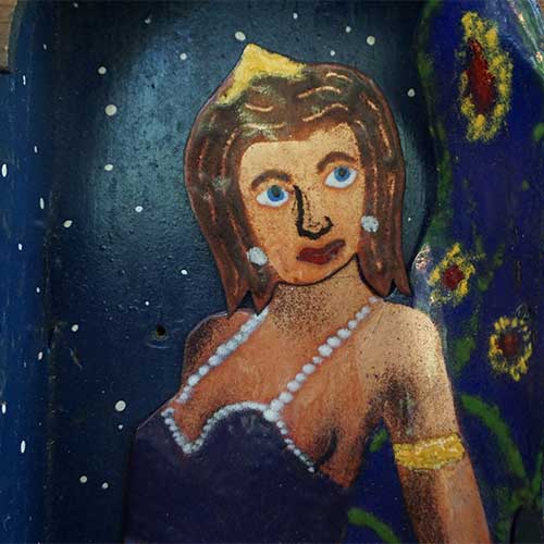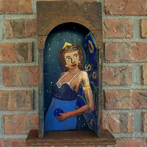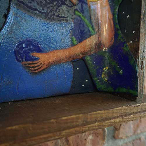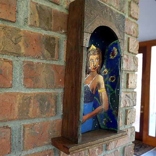 Many of Denny Maloney's artworks have spiritual or religious references. A lot of pieces incorporate found and salvaged objects. Tin ceiling tiles and cupboard doors make frames for enamel pieces.