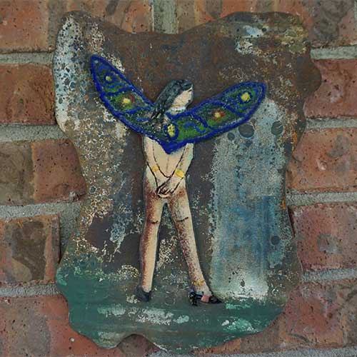 Copper enamel fairy figure on fire tin (tin salvaged following a fire). 11" wide and 14" long. It has a wire for hanging.