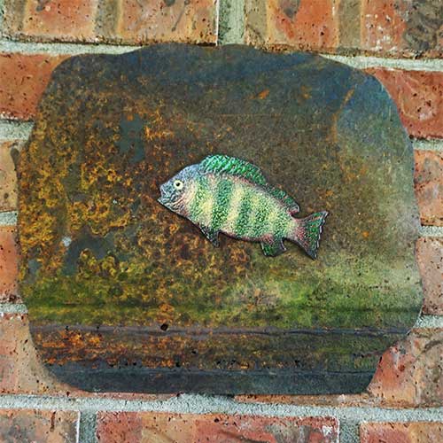 Copper enamel fish figure on fire tin (tin salvaged following a fire). 14" wide and 12" long. It has a wire for hanging.