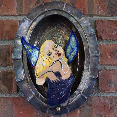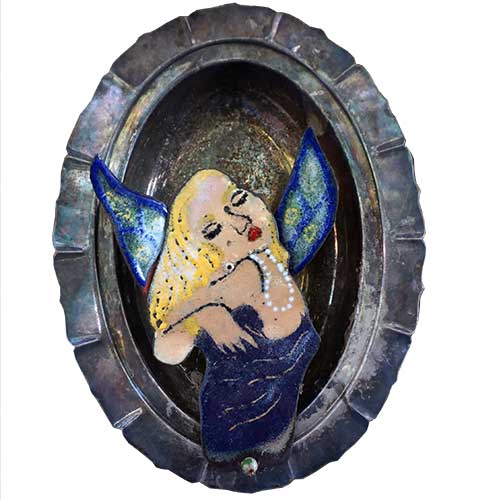 Many of Denny Maloney's artworks have spiritual or religious references. A lot of pieces incorporate found and salvaged objects. Tin ceiling tiles and cupboard doors make frames for enamel pieces.
