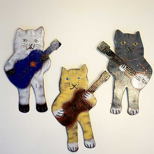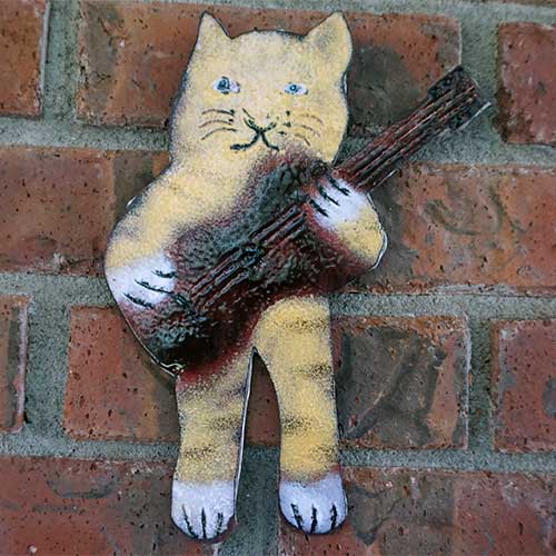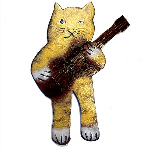 This copper enamel guitar playing cat is is 10.25" long and 8" wide. Hanging wire on the back.