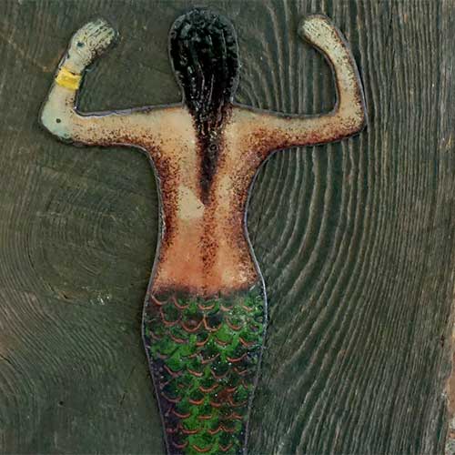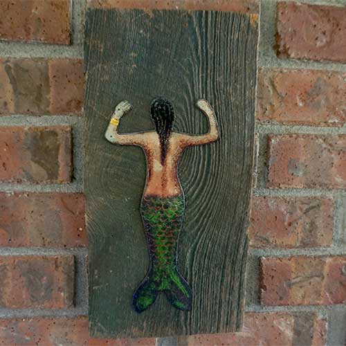 This mermaid on a piece of old wood measures 7.5" wide and 15" in length and 1" thick. It has a wire for hanging.