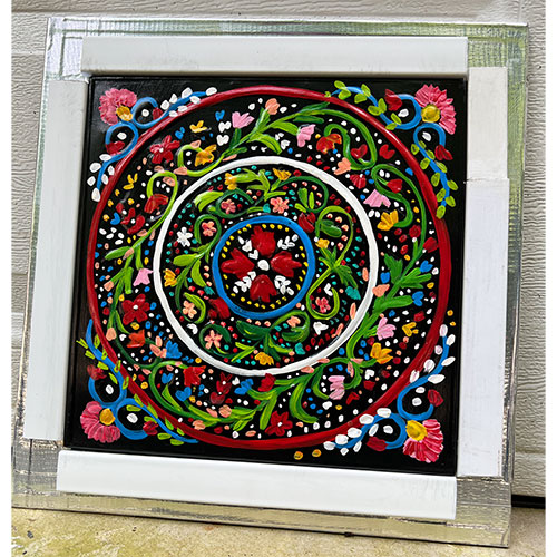 This painting titled, "Country Quilt" is painted on ceiling tin and framed, measuring 16" x16" (includes the frame). The frame is mixed media created with wood and duct tape by the artist.
