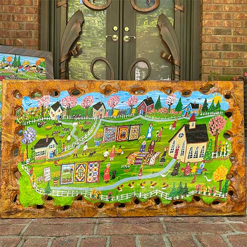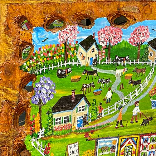This painting titled, "Farm Life" is painted on a thick piece of wood with a "natural" holey frame. Measuring 33.5" wide and 19" long. A close look at the painting reveals several different "scenes".