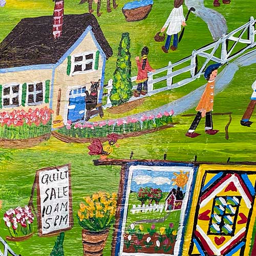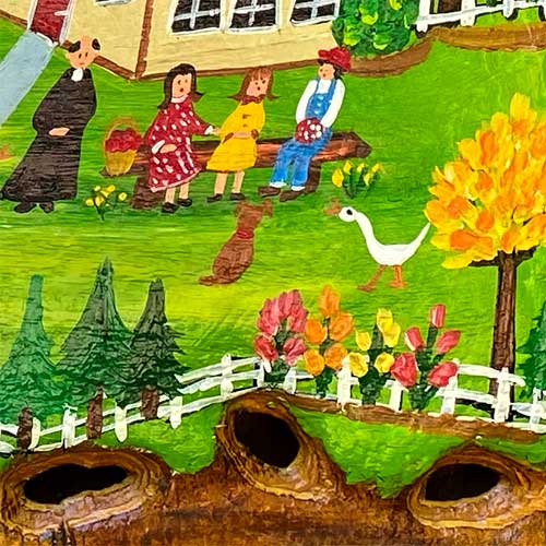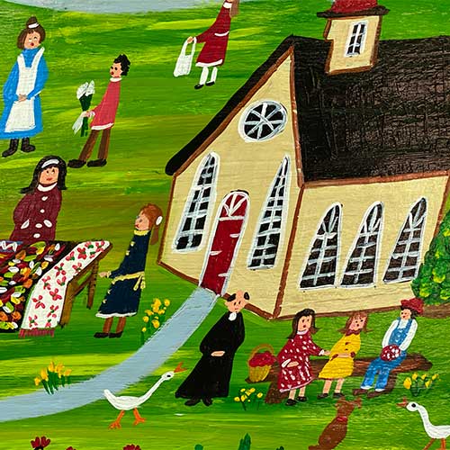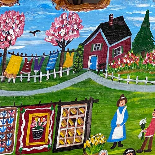 Ilona Fekete was born in a small town in Hungary in 1953. The daughter of a farmer, Ilona developed her love of traditional Hungarian crafts such as crocheting and fine needle embroidery, which were passed down through the generations. Upon coming to Canada at the age of 16, Ilona married and had 3 daughters. While raising a family, she developed her love of folk art painting by studying traditional European folk artists. Now semi-retired, Ilona spends her time developing naïve renderings of everyday life. Ilona’s paintings tell a story of rustic simplicity through bold colors and whimsical simplicity.